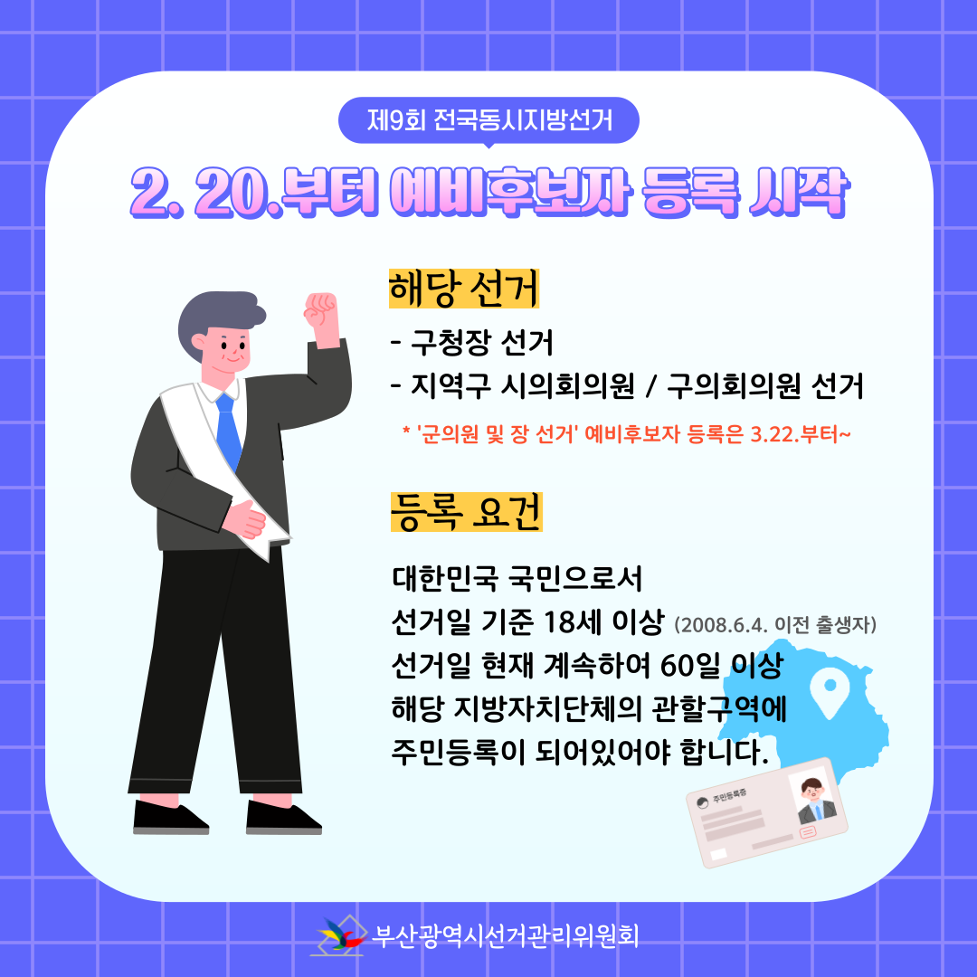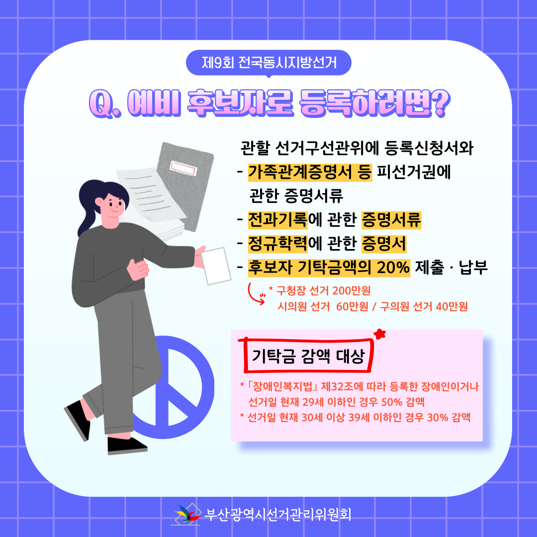 부산광역시선거관리위원회(051-851-7791)에서 제작한 [선거 ON-AiR] 제9회 전국동시지방선거 예비후보자 등록안내 저작물은 "공공누리" 출처표시-상업적 이용금지-변경금지 조건에 따라 이용할 수 있습니다. 자세한 내용은 [저작권정책]을 확인하십시오.
