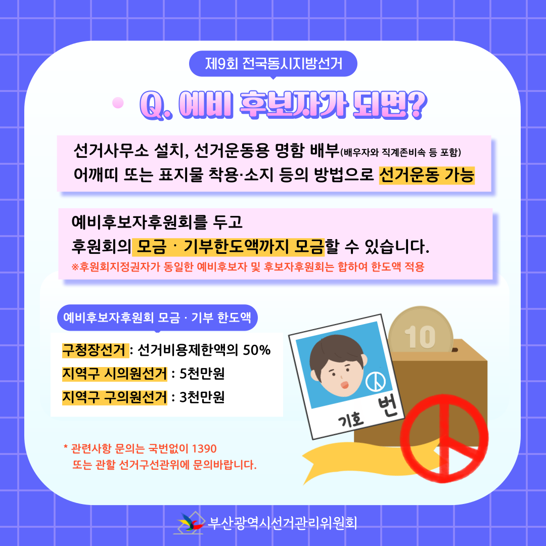 예비후보자 등록에 필요한 사항 또는 선거운동 방법과 관련하여 궁금한 사항은 국번 없이 1390번 또는 관할 선거구선관위에 문의주시길 바랍니다.