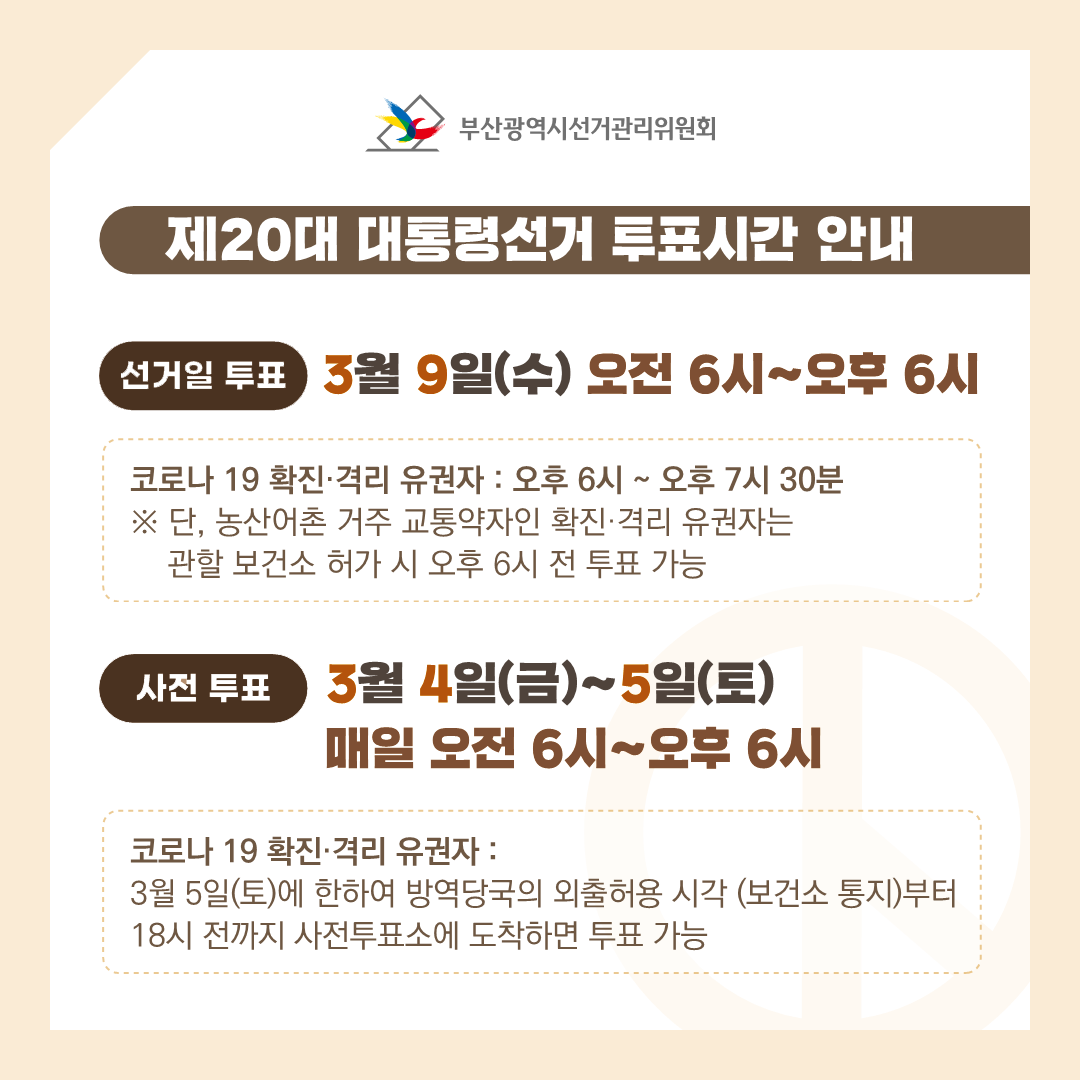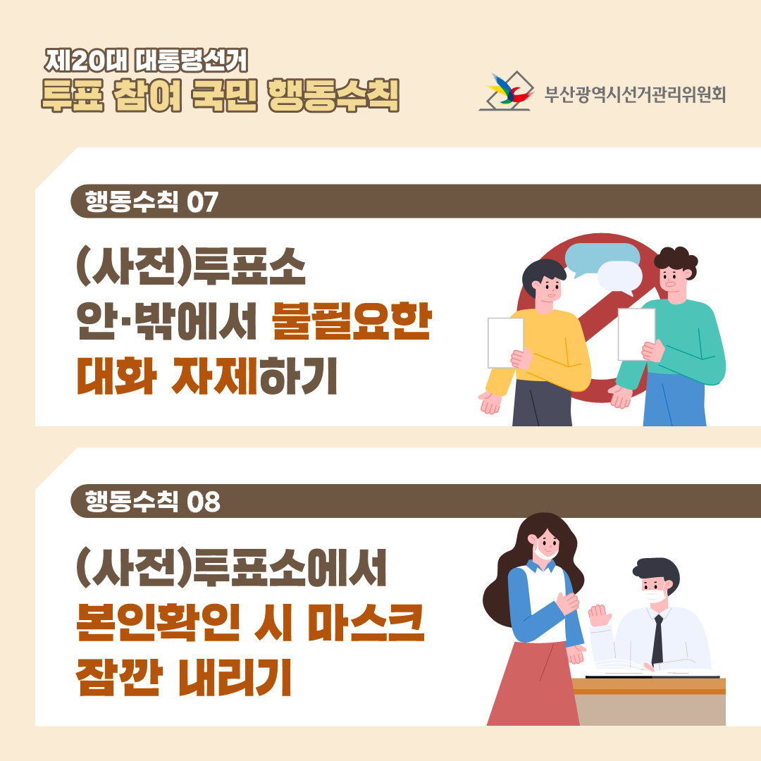 부산광역시선거관리위원회(0518517770)에서 제작한 제20대 대통령선거 카드뉴스 - 투표 참여 국민 행동수칙 저작물은 "공공누리" 출처표시 조건에 따라 이용할 수 있습니다. 자세한 내용은 [저작권정책]을 확인하십시오.